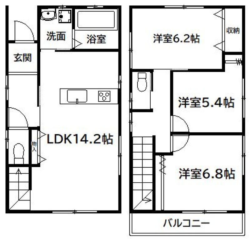 3LDK(LDK14.2帖、洋室6.8帖、洋室6.2帖、洋室5.4帖)