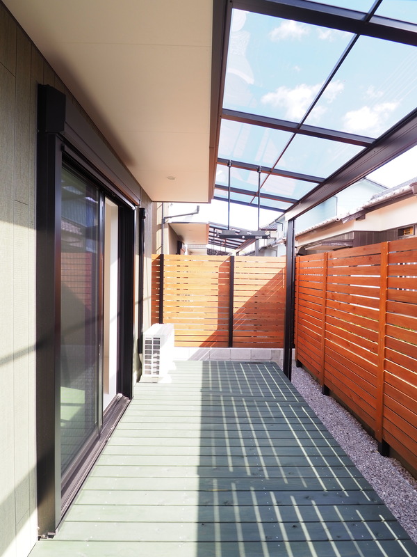ウッドデッキは屋根付きでお子さんのプール遊びなどもできる広さ!