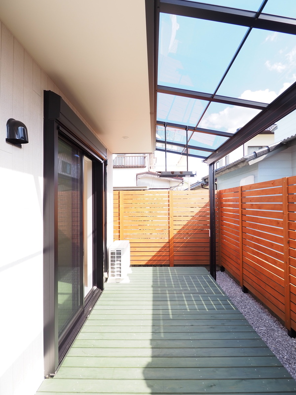 ウッドデッキは屋根付きでお子さんのプール遊びなどもできる広さ!